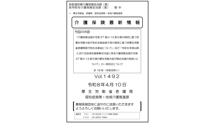 「介護保険法施行令第37条の13第5項の規定に基づき厚生労働大臣が定める事由第5号の規定に基づき厚生労働省老健局長が定める事由について」及び「令和6年度以降 における地域支援事業交付金に係る介護保険法施行令第 37 条の13 第5項の厚生労働大臣が認める額の取扱いについて」の一部改正について 2026.04.13 2026.04.16 [Nコメント]令和8年度報酬改定に伴い、標記通知の一部を下記のとおり改正し、令和8年4月1日から適用することとした 介護保険最新情報vol.1492(PDF:638KB) 介護保険情報をもっと見る 介護保険法施行規則の一部を改正する省令の公布について(通知) 前の記事 令和 8 年10月貸与分から適用される福祉用具の 全国平均貸与価格及び貸与価格の上限の公表 について(新商品に係る分) 次の記事