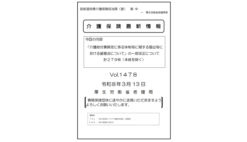 「介護給付費算定に係る体制等に関する届出等に おける留意点について」の一部改正について 2026.03.16 2026.03.18 [Nコメント]令和8年度介護報酬改定の実施に向けて、下記のとおり改正し、令和8年6月1日から適用することとしたため通知する。 介護保険最新情報vol.1478(PDF:5.0MB) 介護保険情報をもっと見る 「指定居宅サービスに要する費用の額の算定に関する基準(訪 問通所サービス、居宅療養管理指導及び福祉用具貸与に係る 部分)及び指定居宅介護支援に要する費用の額の算定に関す る基準の制定に伴う実施上の留意事項について」及び「指定 介護予防サービスに要する費用の額の算定に関する基準の制 定に伴う実施上の留意事項について」の一部改正について 前の記事 「介護職員等処遇改善加算に関する基本的考え方並びに事務処 理手順及び様式例の提示について(令和8年度分)」及び「介護 職員等処遇改善加算に関するQ&A(第1版)」について 計64枚(本紙を除く) 次の記事