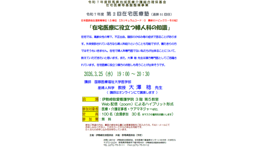 [R8.3.25開催]令和7年度 第2回在宅医療塾(主催:伊勢崎佐波医師会)の開催について 2026.02.17 講習会・研修会情報 PDFで見る 【開催日と会場変更されました】[R8.2.17開催]令和7年度 第1回在宅医療塾(主催:伊勢崎佐波医師会)の開催について 前の記事